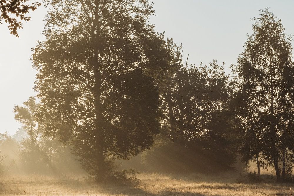 De zon kwam prachtig door de bomen heen, door een beetje mist zag je prachtig de stralen.