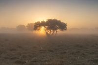 Een betoverende vroege ochtend bij zonsopkomst, bij de Boerenveensche Plassen in Drenthe, waar de eerste zonnestralen zich een weg banen door de nevelige stilte van het Drentse landschap. De eenzame boom in het midden van het veld vangt het gouden licht op en vormt een natuurlijk kader voor deze serene zonsopkomst.