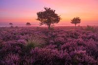 Prachtige kleuren van de bloeiende heide op de Veluwe, versterkt door de weerkaatsing van de hevige kleuren in de lucht! De zonsopkomst was voor enkele minuten deze ochtend fenomenaal!