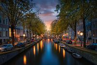 Een klassiek beeld van Amsterdam. De grachten met de grachtenpanden, de boten in het water, de straten verlicht en op de achtergrond de zon die opkomt. Een mooier moment kun je bijna niet wensen.