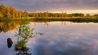 Een 16:9 foto van een warme sfeervolle zonsopkomst bij natuurgebied Appelbergen, een prachtig stuk natuur in Glimmen, op de grens van Drenthe en Groningen.