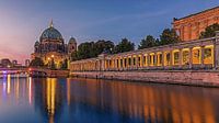 Een digitale olieverf bewerking van een zonsopkomst in Berlijn met blik over de Spree Rivier richting de Dom van Berlijn, een Protestantse kerk en dynastiek graf op het museumeiland.