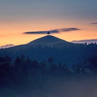 Een vierkante 1:1 foto van een eenzame Lindeboom op een heuveltop op vroege zomerochtend voor zonsopkomst in het Emmental, een dal in centraal Zwitserland, in het kanton Bern.