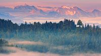 Een 16:9 foto van een mistige zomerochtend tijdens zonsopkomst in het Emmental, een dal in centraal Zwitserland, in het kanton Bern, met uitzicht op de sneeuwtoppen van de Zwitserse Alpen in het Berner Oberland.