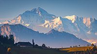 Een 16:9 foto in zacht blauwe tinten van een vroege ochtend in het Emmental, een dal in centraal Zwitserland, in het kanton Bern, met uitzicht op de sneeuwtoppen van de Zwitserse Alpen van het Berner Oberland.