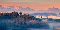 Een weids 2:1 beeld van een mistige zomerochtend tijdens zonsopgang in het Emmental, een vallei in centraal Zwitserland, in het kanton Bern, met uitzicht op de met sneeuw bedekte Zwitserse Alpen in het Berner Oberland.