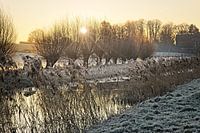 Gouden zonsopkomst op een koude winterochtend achter de knotwilgen langs de gracht naar de Watermolen van Partij-Wittem.