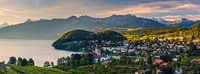 Als u iets groots zoekt voor aan de muur is dit weids panorama beeld van een mooie zomer zonsopkomst in Spiez aan het meer van Thun, gelegen in het Berner Oberland precies wat u zoekt.