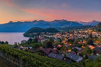 Een mooie zomer zonsopkomst in Spiez aan het meer van Thun, gelegen in het Berner Oberland.