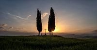 Zonsopkomst nabij het kruis en de cypressen van Croce di Prata nabij San Quirico d'Orcia in Toscane, Italië