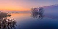 Een voorjaarsochtend met een laagje mist over het water en een mooie zonsopkomst in 2:1 formaat in Tusschenwater, een natuurgebied in de gemeente Tynaarlo in de Nederlandse provincie Drenthe.