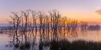 Een voorjaarsochtend en een mooie zonsopkomst in 2:1 formaat in Tusschenwater, een natuurgebied in de gemeente Tynaarlo in de Nederlandse provincie Drenthe.