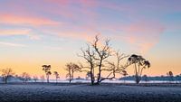 De zonsopkomst zorgt voor de prachtige kleuren in de lucht. De bomen zijn een goed onderwerp en steken mooi af tegen de lucht.