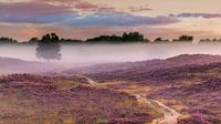 Een 16:9 foto van mistige zonsopkomst in Augustus waar de paarse heide in bloei staat en een laagje ochtendmist over de velden in de Gasterse Duinen, een natuurgebied in Gasteren dat bestaat uit zandruggen en natte veenkommen.