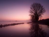De zon kleurt de laag mist roze en paars. Een koude ochtend zorgt voor het laagje mist boven het warmere water. Vanuit de Maasheggen is begint een mooie dag aan de Maas. Het Land van Cuijk is een voormalige heerlijkheid die lag in wat tegenwoordig het noordoosten van de provincie Noord-Brabant is. De heerlijkheid werd begrensd door de Maas en de Peel. Het land van Cuijk bestond uit twee gebieden die van elkaar gescheiden werden door de heerlijkheid Boxmeer. Langs de Maas liggen veel weilanden, al sinds eeuwen omgeven door de maasheggen: meidoornhagen die in mei in bloei staan. Deze zijn door hun unieke karakter een cultureel erfgoed. Naast de Maasheggen kent het land van Cuijk ook veel heide, waterplassen en bossen. Vanuit deze Maasheggen heeft u mooi uitzicht op het land van Cuijk. Langs de Maas is het goed wandelen. De Maas is een 950 kilometer lange rivier in West-Europa. De Maas ontspringt in Frankrijk en stroomt daarna nog door België en Nederland. In Nederland is de Maas de zuidelijkste van de grote rivieren en mondt ze in de Nederlandse rivierdelta uit in de Noordzee. Vanaf Geijsteren gaat de Maas de grens met Noord-Brabant vormen. Bij Boxmeer worden nog twee bochten van de Maas rechtgetrokken; daarna maakt ze bij Cuijk een zeer ruime bocht naar links richting het westen. Vanaf Mook ligt niet Limburg, maar Gelderland op de rechteroever.