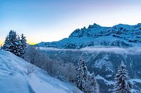 Een prachtige vroege ochtend in de Zwitserse Alpen, op de bergtop Planachaux te Champéry. De zon kwam langzaam tevoorschijn boven de bergtoppen.