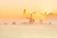 Deze sfeervolle foto toont een iconische Nederlandse molen die opdoemt uit de ochtendnevel. De zonsopgang kleurt de lucht in warme tinten van geel en oranje, waardoor een magisch en vredig tafereel ontstaat. De zachte mist hangt nog laag over de velden, wat de serene en dromerige sfeer versterkt. Dit beeld is genomen op een kalme herfstochtend, waarbij het stille landschap en de klassieke molen in perfecte harmonie samenkomen. De tegenlichtopname van de zon, gecombineerd met de nevel, zorgt voor een mystiek effect, wat dit een betoverend stuk maakt voor aan de muur. Ideaal voor liefhebbers van rustieke landschappen en de Nederlandse cultuur.