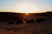 Zonsopkomst in de woestijn waar de zon de kamelen begroet in de zandduinen. Zij zijn weer klaar voor een nieuwe dag.
