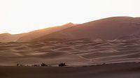 De zon komt bijna boven de zandduinen van Erg Chebbi in Marokko uit. In de verte zie je de karavaan lopen tussen de kleine duinen door.