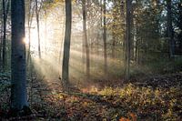Zonnestralen door de bomen van Heverleebos in België in de herfst.