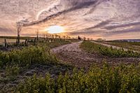 De zon breekt door de wolken boven de velden bij het dorp Wijlre op deze winterse dag in het Zuid-Limburgse Heuvelland (Nederland).
