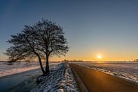 Zonsopkomst in een besneeuwd landschap met een grote boom als blikvanger en een landweg en bevroren sloot die als leidende lijnen naar de horizon leiden. Het gouden uur geeft een mooie zachte gloed over dit winterse landschap. Deze foto is gemaakt in het Nationaal park de Weerribben-Wieden, dichtbij Giethoorn in Nederland.