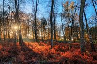 Prachtige tegenlicht opname van het Grebbebos op de Grebbeberg bij Wageningen en Rhenen met mist, zonnestralen, witte berken en rode varens tijdens zonsopkomst in de herfst