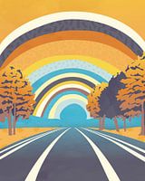Abstract landschap met een weg tussen bomen, recht de opkomende zon in. Het sunburst-ontwerp en de kleuren (geel, oranje, rood, blauw, paars en wit) zijn een eerbetoon aan outdoor-posters uit het midden van de laatste eeuw en geinspireerd van de vroege ochtend in de lente.