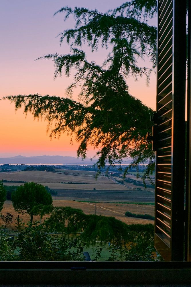 Zonsopkomst vanuit de autentieke slaapkamer van Casa la Terrazza in Umbrië. Uitkijkend over de streek die direct grenst aan Toscane en in de verte zie je het meer van Trasimeno, Lago Trasimeno. In de vroege ochtend van een warme zomerdag is deze foto gemaakt en de zon is nog niet opgekomen maar geeft de lucht al een prachtige oranje gloed. Op naar weer een mooie dag in Italie
