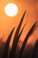 Een close-up van dauwdruppels aan riet tijdens de zonsopkomst op een mistige ochtend. De dauwdruppels steken mooi af tegen de vale zon op de oranje gekleurde achtergrond.