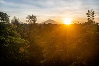 Warme zonsopkomst met de Vulkaan Gunung Agung. Gefotografeerd vanuit Ubud met de jungle op de voorgrond. Gele zonnestralen belichten de planten en bomen van de jungle
