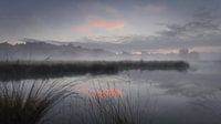 Zonsopkomst met laaghangende nevel in de Hatertse en Overasseltse Vennen bij Nijmegen. Pasteltinten en nevel gespiegeld in het water van het ven.