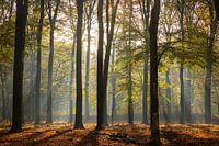 Het is de overgang van de zomer naar de herfst. De bladeren beginnen te verkleuren van groen naar rood-bruin-geel. Er hangt een fijne, mystieke sfeer in het bos. Het geluid wordt gedempt. Het vocht dat bij zonsopkomst optrekt uit de bodem zorgt voor prachtig licht. De lage zon werpt lange schaduwen van de stammen op de bosbodem. Het is heerlijk wandelen in de bossen op de Utrechtse Heuvelrug. Wat een sfeer, eindeloos genieten!