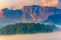 Zonsopkomst met mist over Alpe di Siusi (Duits; Seiser Alm), een Dolomietenplateau en de grootste alpenweide op grote hoogte van Europa. Gelegen in de Italiaanse provincie Zuid-Tirol in het Dolomietengebergte.