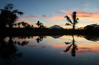 Silhouet van palmbomen en vulkaan Agung tijdens een mooi gekleurde zonsopkomst op Bali. Roze wolken en een blauwe lucht weerspiegelen in het water.