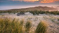 Zonsopkomst in de duinen, met een houten bankje bedekt met zand, op het Nederlandse Waddeneiland Vlieland, in het noorden van Nederland, in de provincie Friesland.