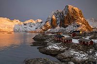 Zonsopkomst op de Lofoten. De zon komt op boven de bekende rode visserhutjes (rorbuer genoemd) op de Noorse eilanden groep van de Lofoten.