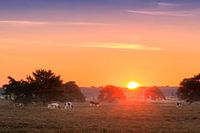 Prachtige zonsopkomst in natuurgebied de Hoge Veluwe in de zomer met grazende koeien op de heide en een oranje gloed