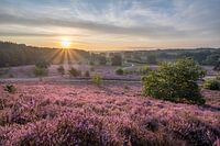 John van de Gazelle Fotografie op Werk aan de Muur. Laat je muren spreken met een prachtig kunstwerk dat een verhaal vertelt. die een Een schilderachtige en sfeervolle landschapsfoto van de zonsopkomst op de prachtig paars bloeiende heide. De zonnestralen breken fraai over de bomen op heuvels van de heide. Het mooie zachte warme goudenlicht van de opkomende zon schijnt mooi over de paars bloeiende heide en geeft het werk een prachtige schilderachtige, serene en warme sfeer. De prachtige wolkenlucht zorgt voor een fraaie dieptewerking in de foto. De prachtige paars bloeiende heide en het zachte goudenlicht van de opkomende zon maken het werk bijzonder warm en kleurrijk. Met deze prachtige foto als wanddecoratie haal je een prachtig modern kunstwerk in huis. Het werk is kleurrijk maar heeft toch een serene sfeer. Dit kunstwerk is een prachtige wanddecoratie voor je lege plek aan de muur te vullen, waar je elke dag weer opnieuw van kunt genieten. Deze foto is in liggend (landschap) formaat. Dit moderne kunstwerk past bij vele woonstijlen en interieurs en vooral bij mensen die van de natuur houden. Dit werk “Zonsopkomst op de bloeiende heide“ wordt je aangeboden door John van de Gazelle Fotografie op Werk aan de Muur. De Brunssummerheide is een prachtig natuurgebied gelegen te Brunssum in de provincie Limburg. Het is een natuurgebied van c.a. 600 hectare en is in beheer van Natuurmonumenten. De Brunssummerheide grenst aan de Schrieversheide een van de meer heuvelachtige heidegebieden in Nederland. De Schrieversheide is het grootste heidegebied in Zuid-Limburg. Je kunt hier volop genieten van hoogteverschillen en fraaie vergezichten. In dit prachtige heidegebied ontspringt ook de Rode Beek. Deze vormt dwars door de heide een venig en moerassig beekdal met een voor Nederland bijzondere vegetatie en begroeiing. Als ik landschappen ga fotograferen zal ik er meestal voor kiezen om tijdens de zonsopkomst en ondergang te fotograferen. Tijdens deze tijd ook wel de goudenuurtjes genoemd is het licht op zijn mooist. Het licht is dan mooi zacht en warm van kleur en zorgt voor mooie lange schaduwen. Dit zachte warme licht zorgt voor fraaie kleuren en een mooie zachte sfeer in de foto. Een prachtige wanddecoratie voor je lege plek aan de muur te vullen, die elke dag weer weet te boeien. Dit fraaie moderne kunstwerk "Zonsopkomst op de bloeiende heide" word aangeboden door " John van de Gazelle Fotografie op Werk aan de Muur kunstwerken die je muren
