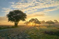 De wekker om 4.45 uur. Ontbijt, kopje koffie en op naar de Zuiderheide onder beheer van het Goois Natuurreservaat. Deze foto is net na de zonsopkomst waarbij nog een mooi laagje ochtendmist aanwezig is.