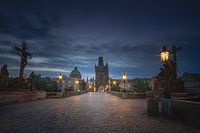 s'ochtends op een lege Karelsbrug in Praag, Tsjechië. Dageraad en schemer