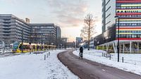 De zon komt op boven een besneeuwd Utrecht Science Park. Ook rijdt een tram voorbij.