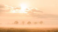 Zonsopkomst in het Staphorsterveld op een mistige morgen. De zon was al even op maar brak op dit moment door de wolken