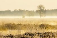 Lichte vorst en laaghangende mist maken een plaatje van een landschap. Dat betekent voor mij vroeg op pad en enkele uren genieten op het Hijkerveld bij zonsopkomst. De geluiden van de veldleeuweriken en de verre roep van de kraanvogels zal een ieder er zelf bij moeten denken. Voor het half 9 is, is al het wit al weer weg en is de zon achter de wolken verdwenen...
