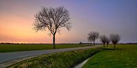 Zonsopkomst op het platteland bij Nunspeet op de Veluwe in Gelderland. Op een koude ochtend in de winter. De ganzen en zwanen komen vanaf het nabijgelegen Veluwe Randmeer en zwermen bij zonsopkomst uit naar de weilanden om te foerageren.