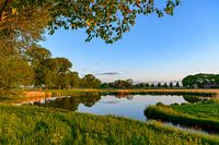 Vroege zonsopgang tijdens een mooie lentedag over de Zwartendijk, de oude Zuiderzeedijk in de IJsseldelta bij Kampen in Overijssel Nederland.