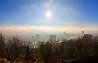 Prachtige mysterieuze opname van de skyline van Luik (Liege), Belgie, op een mistige zonnige winterochtend, met de rivier de maas (meuse) door de stad