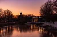 Zonsopkomst in het winterse Middelburg tussen de Oostkerk en de Koepoort