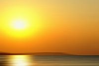 Zonsopkomst zeegezicht in beweging met land in de achtergrond. Een bloed rood geel hemel met een gigantische zon. Foto heeft horizontale beweging, met opzet.