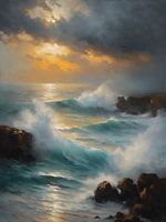 Dit indrukwekkende schilderij vangt de levendige energie van een kustlijn, waar de woeste golven heen en weer deinen onder het warme, gouden licht van de zonsopkomst. De krachtige, expressieve penseelstreken brengen de golven tot leven, alsof ze op het doek blijven bewegen. Het spel van kleuren – van diepe, oceaanblauwe tinten tot zachte, rozerode gloed aan de horizon – creëert een betoverend contrast en vangt perfect de magie van de nieuwe dag die aanbreekt.